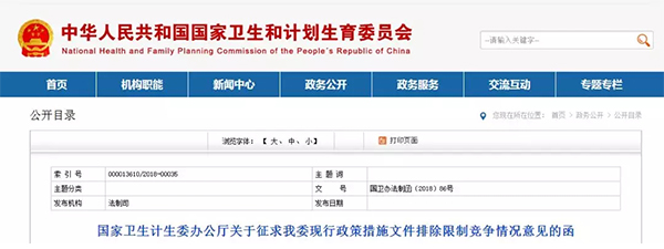不久前,國家衛計委發布《國家衛生計生委辦公廳關于征求我委現行政策措施文件排除限制競爭情況意見的函》(以下簡稱《函》)。