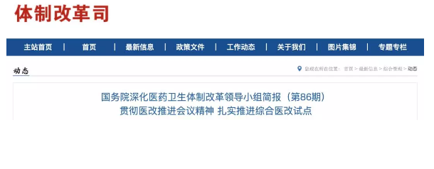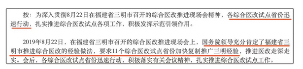 此前,在福建省三明市召開的綜合醫改推進現場會上,國務院領導充分肯定了福建省三明市推進綜合醫改的經驗做法,要求11個綜合醫改試點省份加快復制推廣三明經驗,推進醫改走深走實。