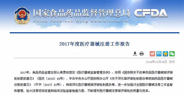 近日,國家食品藥品監督管理總局發布《2017年度醫療器械注冊工作報告》,報告中提到,2017年,食品藥品監管總局按照《創新醫療器械特別審批程序(試行)》,批準了部分創新醫療器械產品上市。共收到創新醫療器械特別審批申請273項,完成323項審查(含2016年申請事項),確定63個產品進入創新醫療器械特別審批通道。
