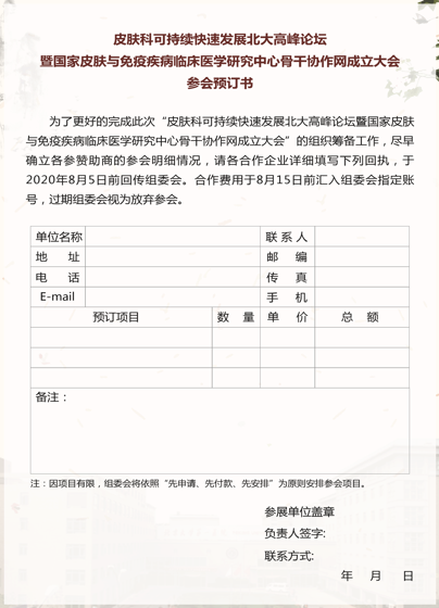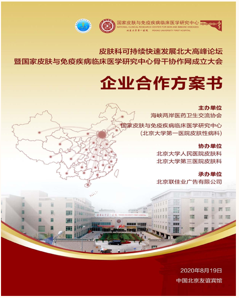 皮膚科可持續快速發展北大高峰論壇暨國家皮膚與免疫疾病臨床醫學研 究中心骨干協作網成立大會于2020年8月19日在京舉行,屆時將邀請國家科 技部、國家衛生健康委、北京大學等各級領導與全國各知名醫院皮膚科主任 一起見證國家皮膚與免疫疾病臨床醫學研究中心全國協作網及工作平臺的建 立,共同探索醫療、教學、科研等多個層面如何開展交流與協作,以實現皮 膚學科可持續快速發展的共贏之路。同期將舉行皮膚科多場專業學術活動。