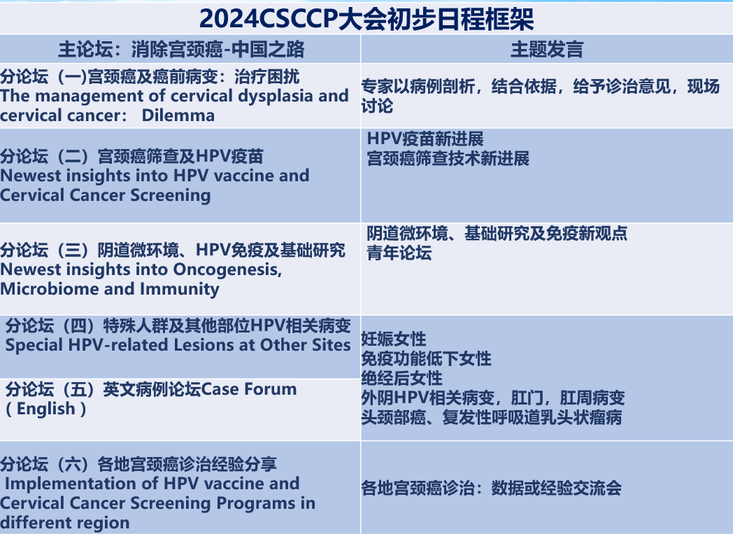 本次大會初步設置一個主論壇:消除宮頸癌中國之路;六個分論壇圍繞宮頸癌篩查及HPV疫苗新進展、陰道微環境、HPV免疫及基礎研究、特殊人群及HPV相關部位、病例討論英文場及各地宮頸癌診治經驗等。會前將舉辦半天基于病例的CSCCP陰道鏡和細胞病理培訓。