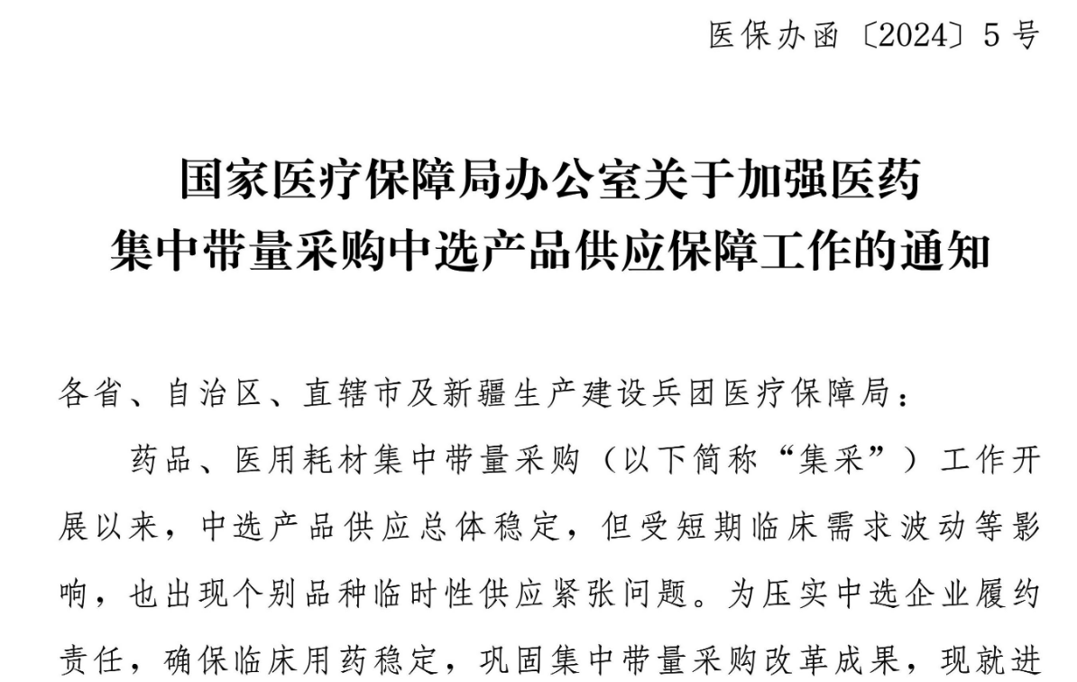 《通知》指出,藥品、醫用耗材集中帶量采購 (以下簡稱“集采”) 工作開展以來,中選產品供應總體穩定,但受短期臨床需求波動等影響,也出現個別品種臨時性供應緊張問題。