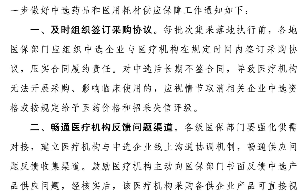 文件中提出及時組織簽訂采購協議、暢通醫療機構反饋問題渠道、積極協調應對短時間激增需求、做好中選產品供應情況監測、探索建立供應情況評價機制、加強供應情況評分結果運用等六項舉措,加強集采中選產品供應保障。
