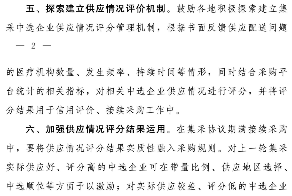 《通知》提出,鼓勵各地積極探索建立集采中選企業供應情況評分管理機制,根據書面反饋供應配送問題的醫療機構數量、發生頻率、持續時間等情形,同時結合采購平臺統計的相關指標,對相關中選企業供應情況進行評分,并將評分結果用于信用評價、接續采購工作中。