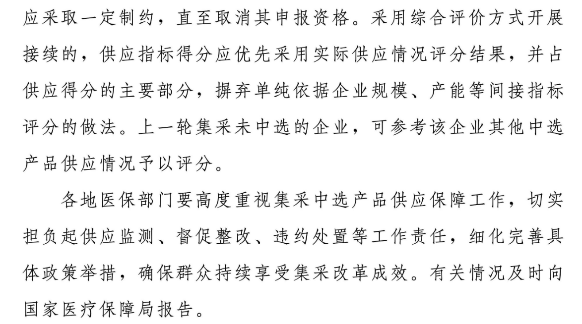 采用綜合評價方式開展接續的,供應指標得分應優先采用實際供應情況評分結果,并占供應得分的主要部分,摒棄單純依據企業規模、產能等間接指標評分的做法。上一輪集采未中選的企業,可參考該企業其他中選產品供應情況予以評分。