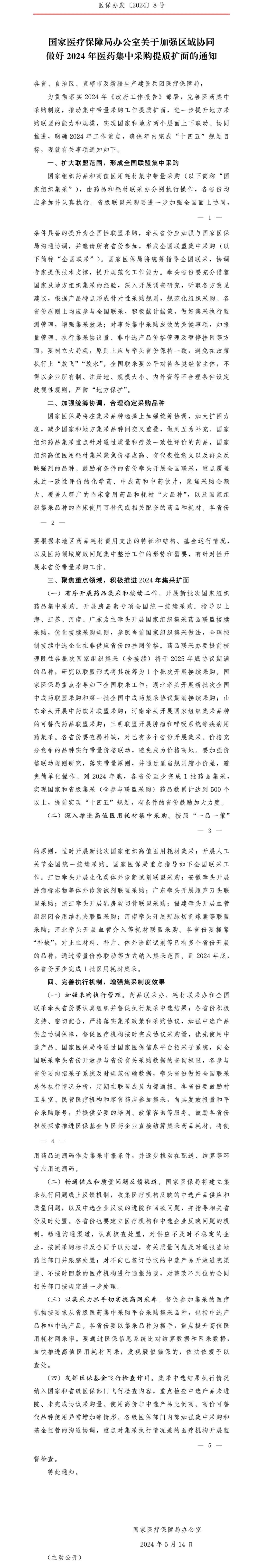 今天(5月20日)下午,國(guó)家醫(yī)保局發(fā)布重磅文件《國(guó)家醫(yī)療保障局辦公室關(guān)于加強(qiáng)區(qū)域協(xié)同做好2024年醫(yī)藥集中采購(gòu)提質(zhì)擴(kuò)面的通知》(全文附文末),2024年耗材集采全面升級(jí),新任務(wù)正式揭曉。