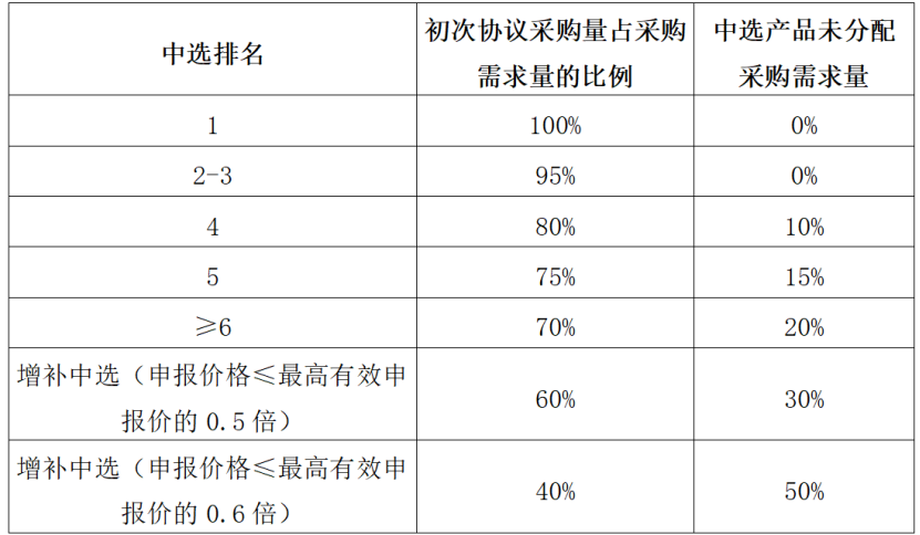 第一步:按中選排名確定初次協(xié)議采購(gòu)量,初次協(xié)議采購(gòu)量占采購(gòu)需求的比例見(jiàn)下表。根據(jù)醫(yī)療機(jī)構(gòu)的采購(gòu)需求量,四舍五入取整,計(jì)算各品種各企業(yè)的初次協(xié)議采購(gòu)量。