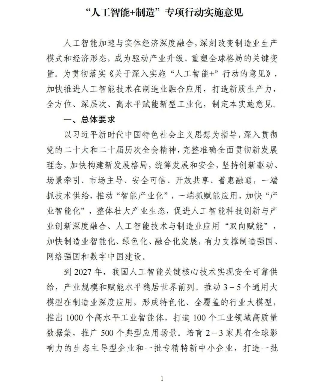 近日,工信部等八部門印發(fā)《“人工智能+制造”專項(xiàng)行動(dòng)實(shí)施意見》(簡(jiǎn)稱《實(shí)施意見》,完整見文末)。