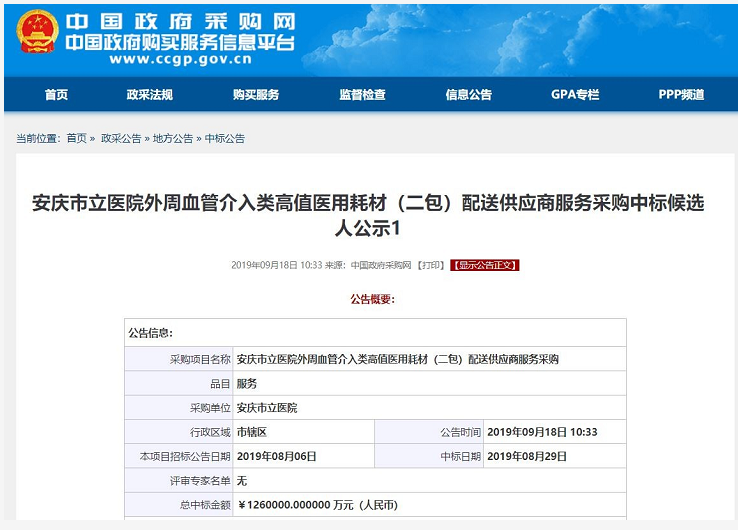 9月18日中國政府采購網(wǎng)發(fā)布《安慶市立醫(yī)院外周血管介入類高值醫(yī)用耗材(二包)配送供應(yīng)商服務(wù)采購中標(biāo)候選人公示1》。