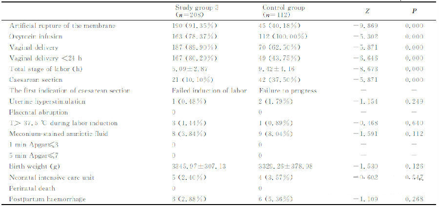 對照組:引產前經陰道檢查確定宮頸Bishop評分≥6分,早晨8∶00~9∶00點開始小劑量縮宮素靜滴(使用輸液泵),方法為:縮宮素2U加入500mL晶體液中,以24mL/h開始靜滴,根據宮縮調整滴速,每15min調整一次,每次增加24mL/h,直到出現有效宮縮(10min內3次宮縮,每次宮縮持續30s以上)為止,最大滴速為144mL/h。如果達到最大滴速仍然不能誘發有效宮縮,則增加縮宮素濃度為1U/100mL后重新調整滴速。靜滴縮宮素期間有專人監護胎心和宮縮情況等。規律宮縮8h仍未臨產者,則停止縮宮素靜滴,休息至次晨再次縮宮素靜滴引產。引產過程中酌情人工破膜。