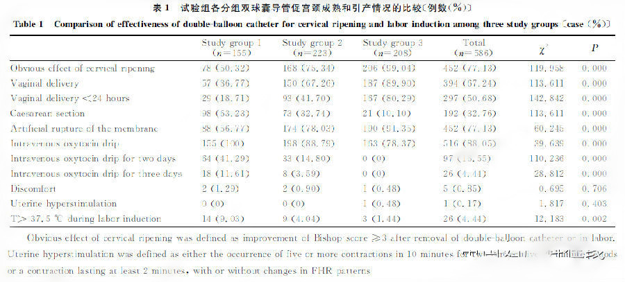 表1 試驗組各分組雙球囊導管促宮頸成熟和引產情況的比較〔例數(%)〕