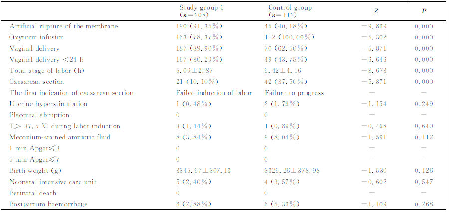 對照組:引產前經陰道檢查確定宮頸Bishop評分≥6分,早晨8∶00~9∶00點開始小劑量縮宮素靜滴(使用輸液泵),方法為:縮宮素2U加入500mL晶體液中,以24mL/h開始靜滴,根據宮縮調整滴速,每15min調整一次,每次增加24mL/h,直到出現有效宮縮(10min內3次宮縮,每次宮縮持續30s以上)為止,最大滴速為144mL/h。如果達到最大滴速仍然不能誘發有效宮縮,則增加縮宮素濃度為1U/100mL后重新調整滴速。靜滴縮宮素期間有專人監護胎心和宮縮情況等。規律宮縮8h仍未臨產者,則停止縮宮素靜滴,休息至次晨再次縮宮素靜滴引產。引產過程中酌情人工破膜。