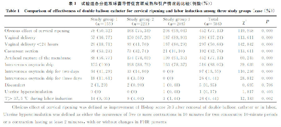 表1 試驗組各分組雙球囊導管促宮頸成熟和引產情況的比較〔例數(%)〕