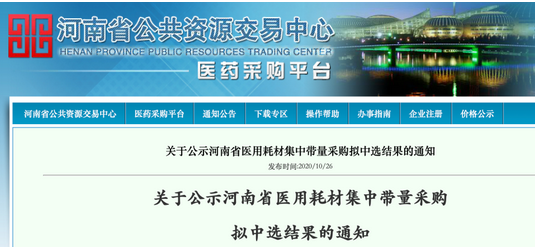 10月26日,河南省公共資源交易中心發布《關于公示河南省醫用耗材集中帶量采購擬中選結果的通知》,根據省醫用耗材集中帶量采購工作安排,現將人工晶體和留置針類醫用耗材擬中選結果進行公示。