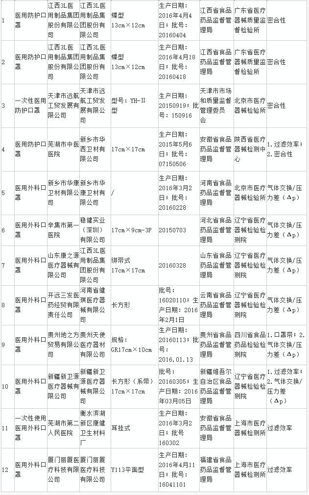 (一)醫用防護口罩3家企業4批產品。江西3L醫用制品集團股份有限公司生產的2批醫用防護口罩、天津市遠航工貿發展有限公司生產的1批一次性醫用防護口罩,密合性不符合標準規定;新鄉市華西衛材有限公司生產的1批醫用防護口罩,過濾效率、密合性不符合標準規定。