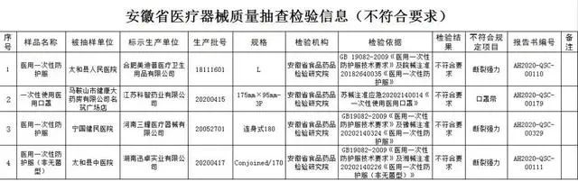 其中,在太和縣人民醫(yī)院抽樣的,標(biāo)示為合肥美迪普醫(yī)療衛(wèi)生用品有限公司生產(chǎn)的醫(yī)用一次性防護服,生產(chǎn)批號18111601,規(guī)格L;寧國健民醫(yī)院抽樣的,標(biāo)示為河南三耀醫(yī)療器械有限公司生產(chǎn)的醫(yī)用一次性防護服,生產(chǎn)批號20052701,規(guī)格連身式180;太和縣中醫(yī)院抽樣的,標(biāo)示為湖南迅卓實業(yè)有限公司生產(chǎn)的醫(yī)用一次性防護服(非無菌型),生產(chǎn)批號20200417,規(guī)格Conjoined/170;均斷裂強力不符合要求。