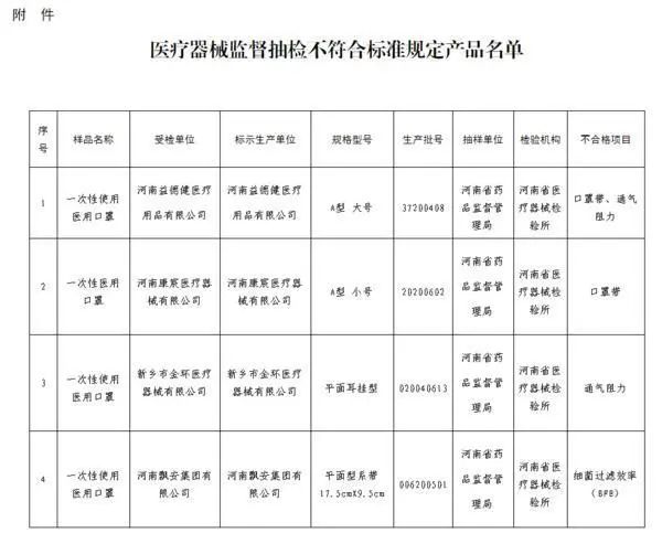 1.河南益德健醫(yī)療用品有限公司生產(chǎn)的1批次一次性使用醫(yī)用口罩,規(guī)格型號:A型大號,生產(chǎn)日期:2020年4月8日,生產(chǎn)批號:37200408,不合格項目:口罩帶、通氣阻力。