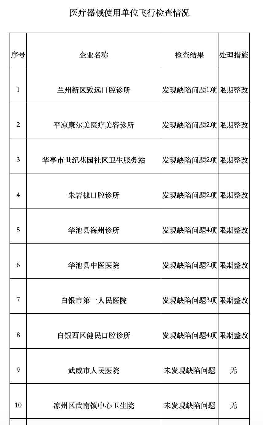 12月11日, 甘肅省藥品監(jiān)督管理局網(wǎng)站發(fā)布的《關(guān)于2020年度部分醫(yī)療器械使用單位飛行檢查情況的通告》顯示,根據(jù)《醫(yī)療器械監(jiān)督管理條例》《醫(yī)療器械使用質(zhì)量監(jiān)督管理辦法》等法規(guī)、規(guī)章規(guī)定,2020年11月16日-11月25日,甘肅省藥品監(jiān)督管理局組織檢查組對省內(nèi)部分醫(yī)療器械使用單位進行了飛行檢查。