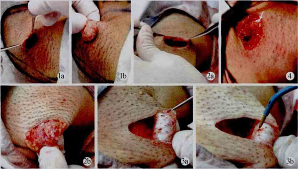圖3 皮瓣修剪后.殘留的毛囊不易清除(3a),采用射頻電波刀處理(3b)