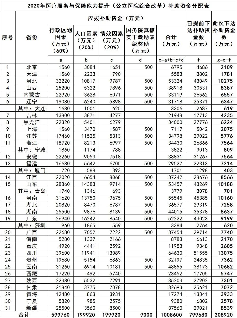 財(cái)政部與國(guó)家衛(wèi)生健康委發(fā)布《關(guān)于下達(dá)2020年醫(yī)療服務(wù)與保障能力提升(醫(yī)療衛(wèi)生機(jī)構(gòu)能力建設(shè))補(bǔ)助資金預(yù)算的通知》,對(duì)各個(gè)省份的資金做了公示。