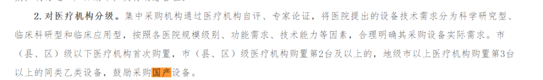 市(縣、區(qū))級(jí)以下醫(yī)療機(jī)構(gòu)首次購(gòu)置,市(縣、區(qū))級(jí)醫(yī)療機(jī)構(gòu)購(gòu)置第2臺(tái)及以上的,地級(jí)市以上醫(yī)療機(jī)構(gòu)購(gòu)置第3臺(tái)以上的同類乙類設(shè)備,鼓勵(lì)采購(gòu)國(guó)產(chǎn)設(shè)備。