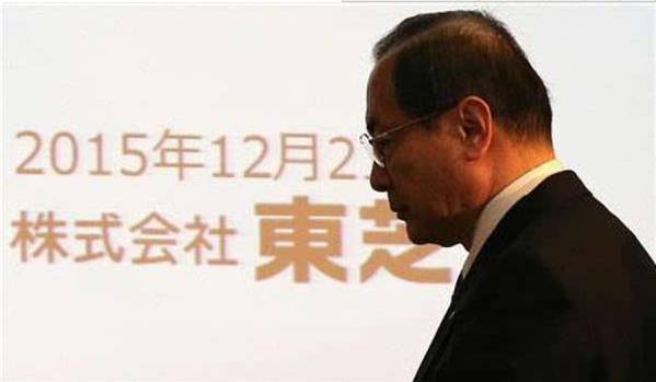 (圖為東芝公司社長(zhǎng)室町正志在發(fā)布會(huì)上鞠躬)