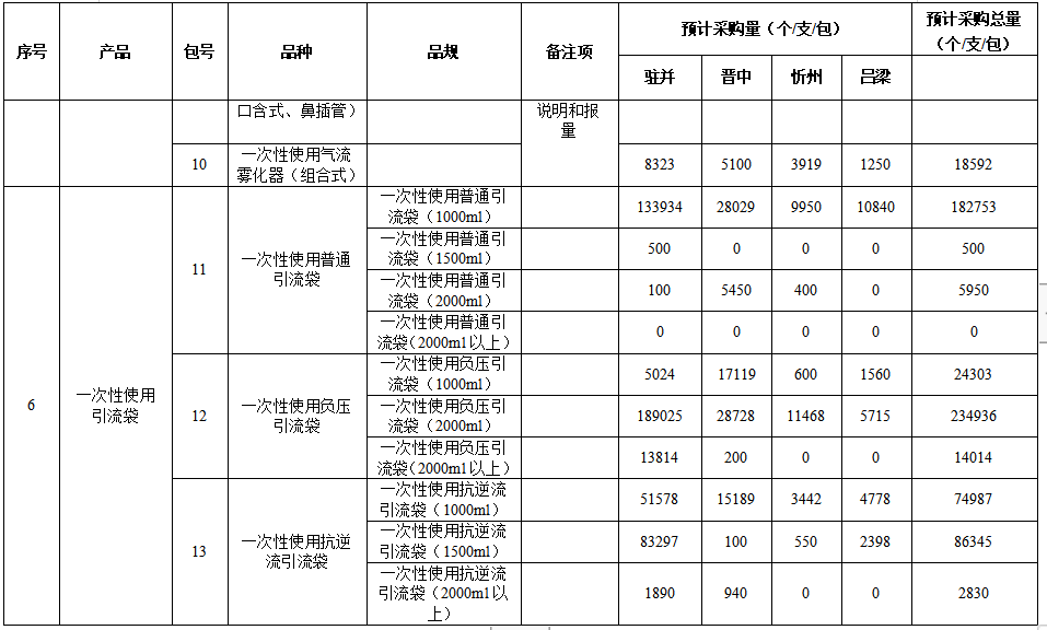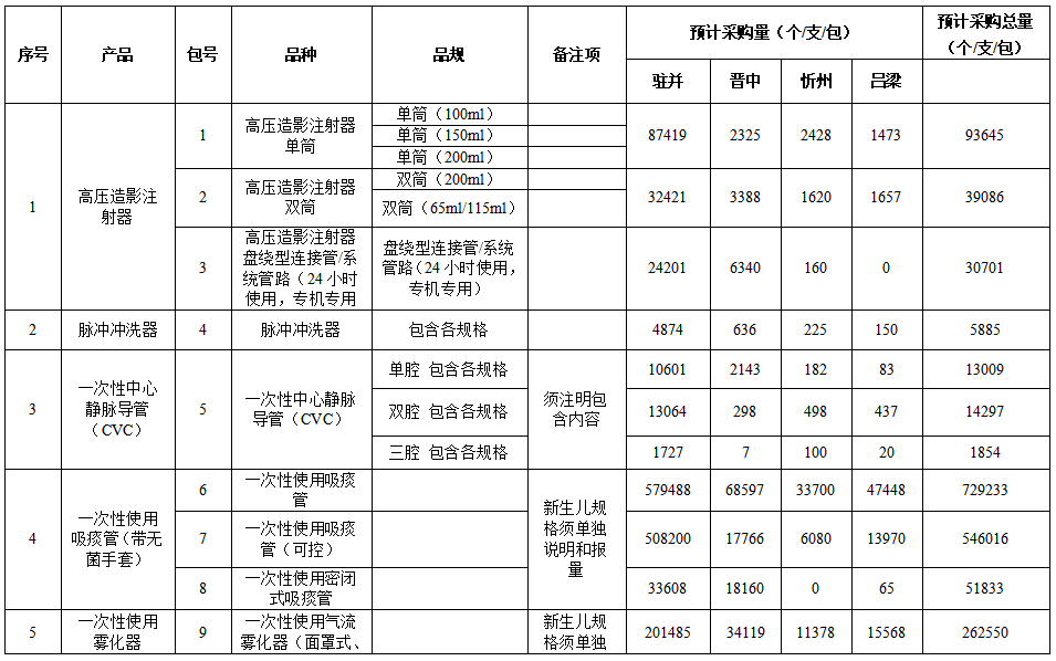 本次集中談判議價采購的耗材有六類,分為13個采購包,包括:高壓造影注射器、脈沖沖洗器、一次性中心靜脈導管(CVC)、一次性使用吸痰管(帶無菌手套)、一次性使用霧化器、一次性使用引流袋。