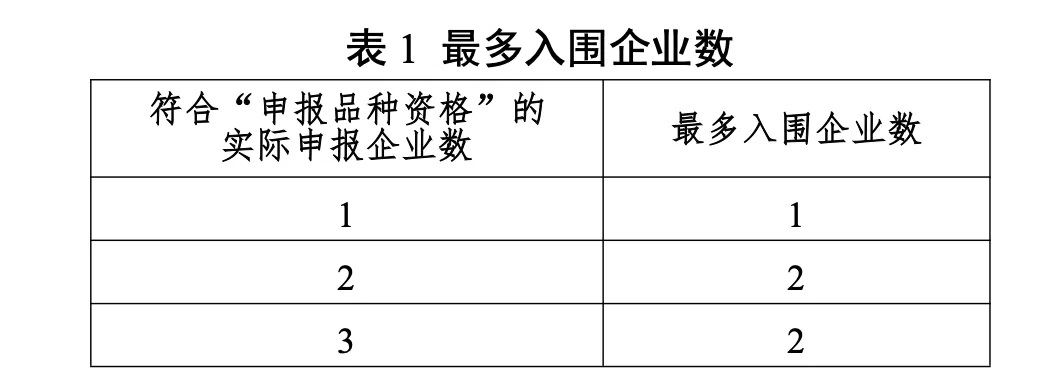 同品種入圍企業根據最多入圍企業數及申報企業順位確定,符合“申報品種資格”的實際申報企業數≥16家時,最多入圍企業數為10家。