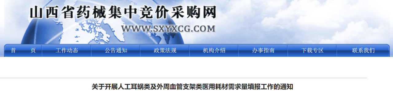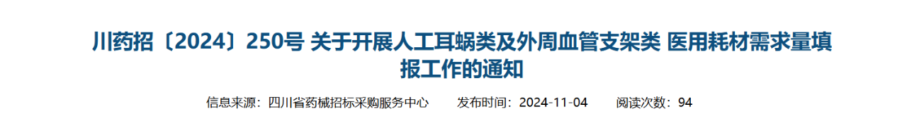 11月4日,山西、四川接連發(fā)布“開展人工耳蝸類及外周血管支架類醫(yī)用耗材需求量填報(bào)工作”的通知。