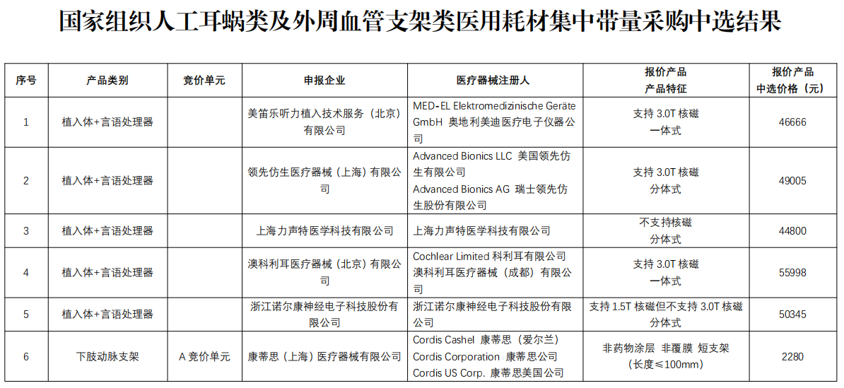 本次集采人工耳蝸類耗材需求量共1.1萬套,5家企業(yè)中選,包括奧地利美迪醫(yī)療、美國(guó)領(lǐng)先仿生、澳大利亞科利耳等外資企業(yè),以及上海力聲特、浙江諾爾康等內(nèi)資企業(yè)。