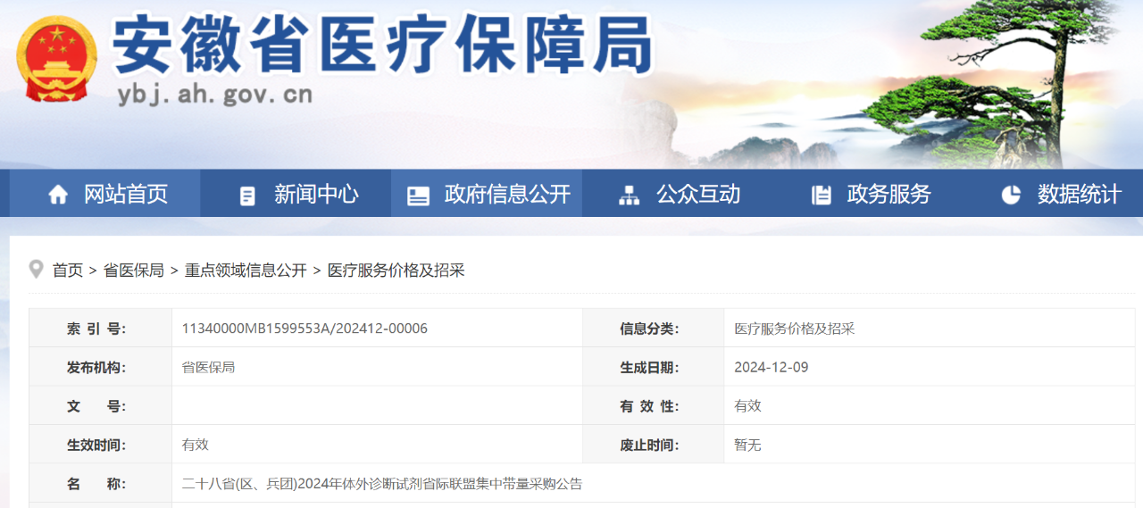 近日,安徽省醫保局發布《二十八省(區、兵團)2024年體外診斷試劑省際聯盟集中帶量采購公告(第1號)》(完整見文末)。