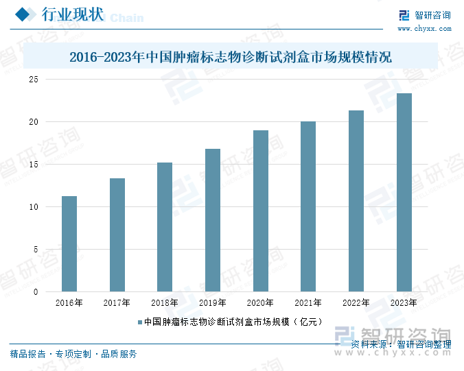 近年來,作為免疫診斷中市場規模最大的板塊之一,腫瘤標志物檢驗的臨床價值被廣泛認可,其市場潛力也開始加速釋放。根據智研咨詢數據,2023年中國腫瘤標志物診斷試劑盒市場規模達23.31億元,同比增長9.28%。