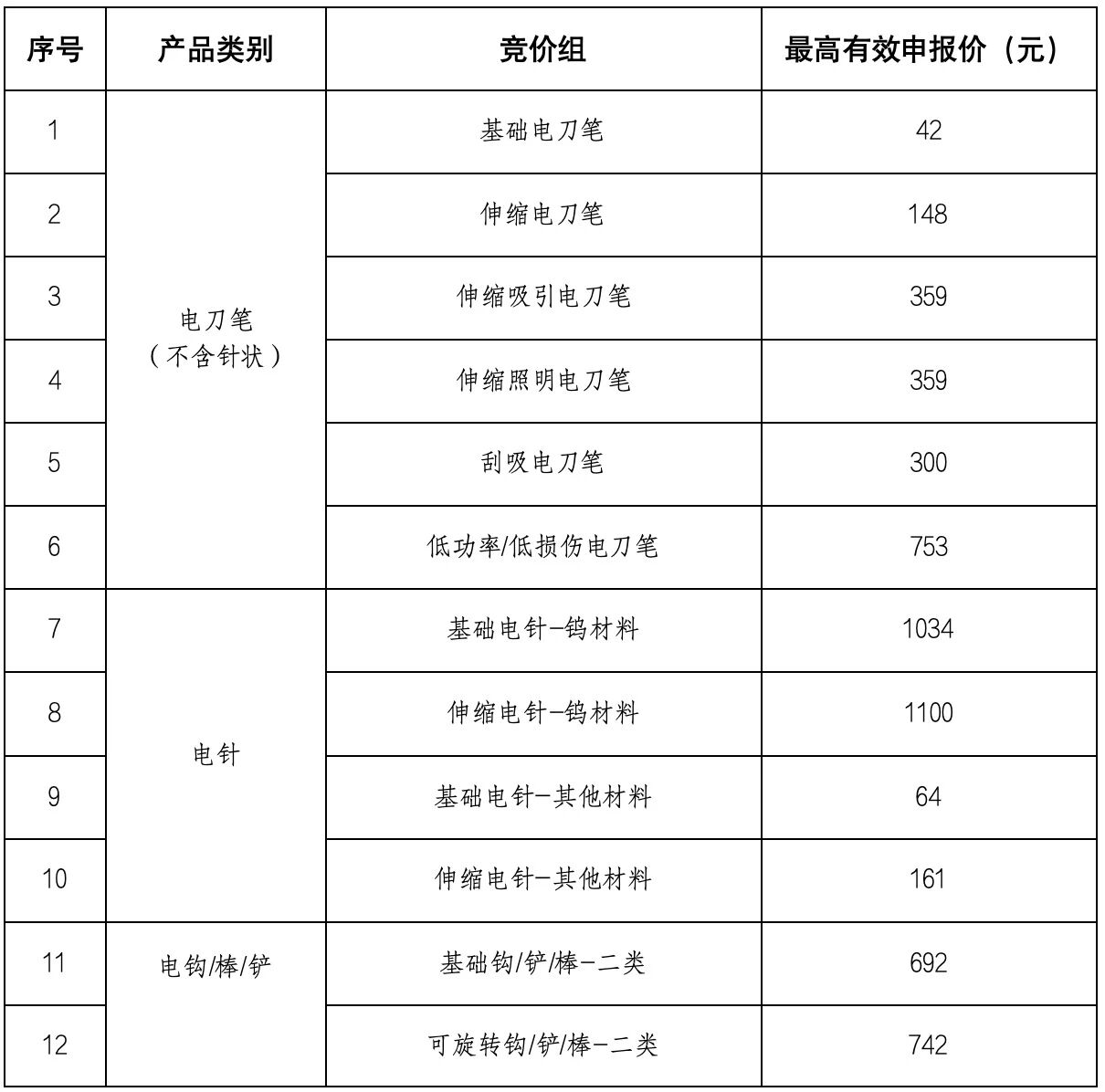 在征求意見稿中,基礎(chǔ)電刀筆有無涂層的最高有效申報(bào)價(jià)分別為80元和55元,在新的競價(jià)組中統(tǒng)一定為43元;電鉗/剪從904元下調(diào)至733元;伸縮照明電刀筆從508元下調(diào)至359元。