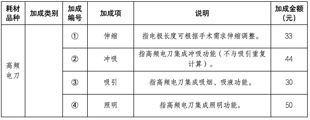 值得注意的是,本輪集采設(shè)置中選產(chǎn)品加成規(guī)則,伸縮、沖吸、照明、電極旋轉(zhuǎn)、涂層材料等均被列入加成項(xiàng),且明確了具體加成金額。