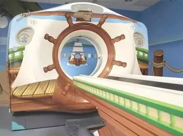 這些創意設計,發達國家比我們走得前一些。下圖為GE公司和美國曼哈頓某醫院共同設計的一款兒童核磁共振器,外觀墻壁粉刷都用了海洋的元素。該設備投入使用后,甚至很多17到21歲的病人也要求使用這款機器進行檢查。