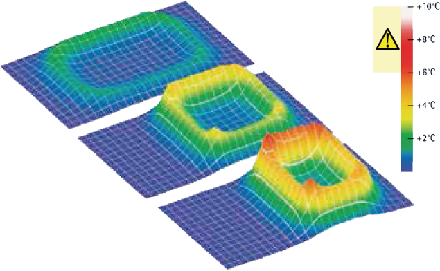 負極板可以安全自動監測、控制和報警,能有效防止儀器在異常情況下灼傷患者,安全性更高。 為了防止電外科手術過程中患者皮膚灼傷,全球電外科安全標準要求分散墊下方的溫升限制為6°C。熱成像測試證明FINESSE + Fin CQM系統可以在發生焊盤部位燒傷之前安全地關閉輸出。頂部圖像顯示完全連接的分散墊的最大溫升為2.2°C。當墊偏離患者皮膚橫向剝離時,Fin CQM系統將檢測到錯誤狀況。在Fin CQM允許的最極端條件下,檢測到的最大溫升為4.4°C(中心圖像)。如果沒有Fin CQM(底部),持續的墊分離會導致明顯的皮膚發熱,這可能會導致嚴重的患者灼傷。