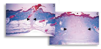 傷口愈合改進 觀察豬皮皮膚切口的縮影(圖3 )與標準的尖端切口(圖4 ),經由梅森氏三色染色顯示纖維增生明顯減少,如膠原沉積的程度和炎癥反應。