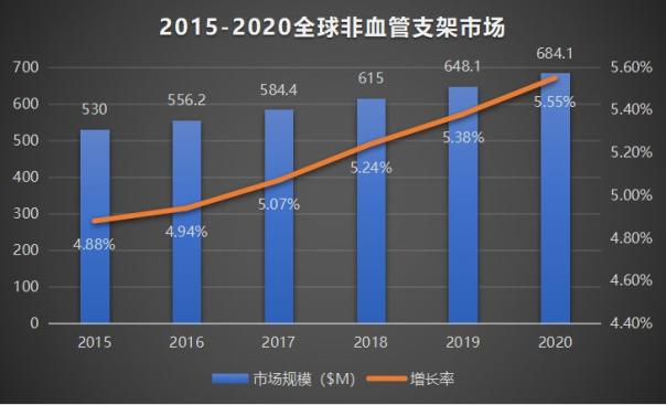 根據美國第三方市場研究機構Technavio發布的《2016-2020全球非血管支架市場報行情》,全球非血管支架市場在2015年達到了大約5.3億美元,預計到2020年,這一市場將以5.24%的年復合增長率增長到6.841億美元,并且市場增速還將從2015年的4.88%上升到2020年的5.55%。