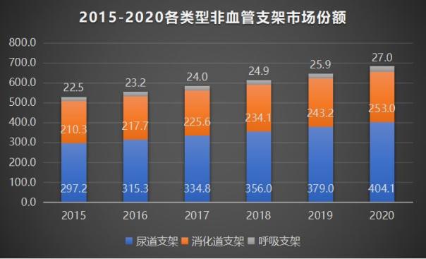 其中,2015年尿道支架以56.08%的市場份額位居第一,消化道支架占39.68%,呼吸道支架占比4.24%。其中,尿道支架包括了輸尿管支架和前列腺支架,消化道支架包括了食管支架、十二指腸支架、結腸支架、膽道支架、胰腺支架;呼吸支架主要是指氣管、支氣管支架或氣道支架。