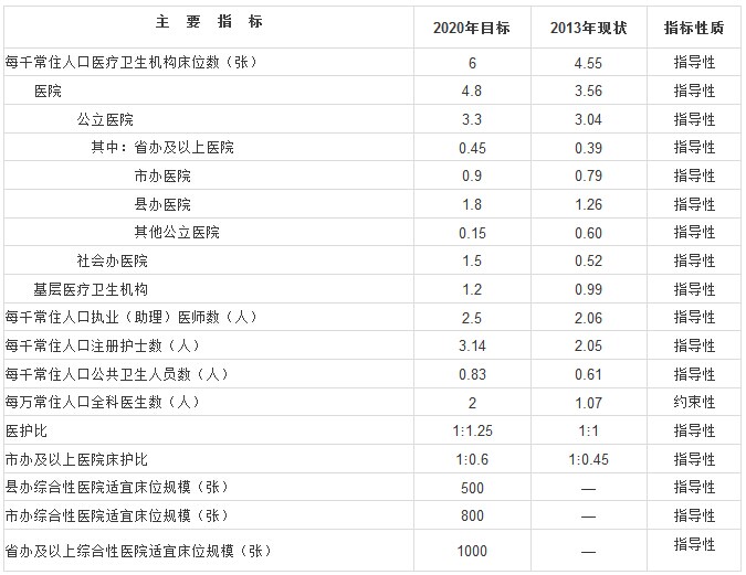 到2020年,每千常住人口醫療衛生機構床位數控制在6張,其中,醫院床位數4.8張,基層醫療衛生機構床位數1.2張。在醫院床位中,公立醫院床位數3.3張,按照每千常住人口不低于1.5張為社會辦醫院預留規劃空間。