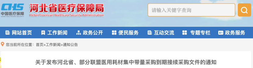 2月8日,河北省醫(yī)保局發(fā)布《關于發(fā)布河北省、部分聯盟醫(yī)用耗材集中帶量采購到期接續(xù)采購文件的通知》(附文末)。