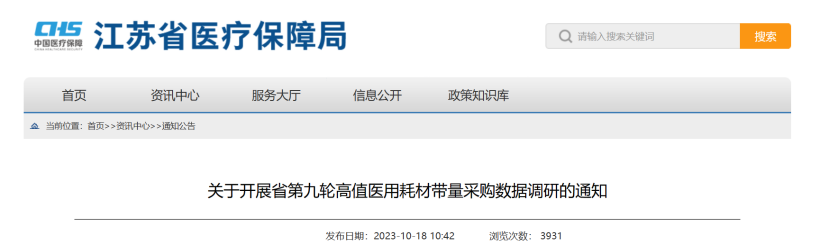 10月18日,江蘇省醫保局發布《關于開展省第九輪高值醫用耗材帶量采購數據調研的通知》(以下簡稱《通知》)。