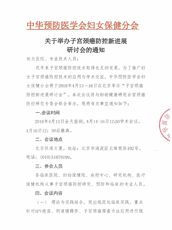 為了推動婦女子宮頸癌防控技術的深入應用與學術交流,推進新知識及新技能在保健和臨床中的轉化和應用,促進學科全面有序的發展,由中華預防醫學會婦女保健分會及婦幼健康研究會宮頸癌防控研究專委會聯合舉辦的 “子宮頸癌防控新進展研討會”將于2018年4月13~16日在北京召開。