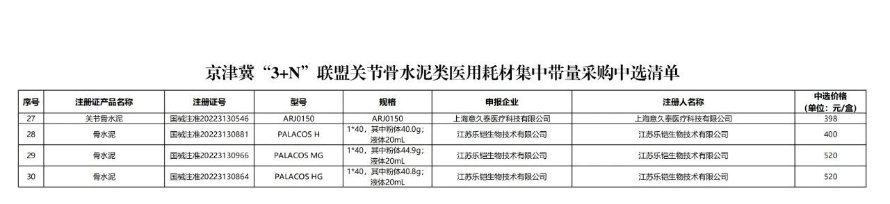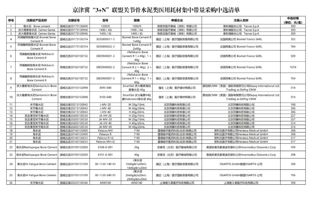 6月12日,京津冀“3+N”醫(yī)藥聯(lián)盟采購辦公室發(fā)布了《關(guān)于公布京津冀“3+N”聯(lián)盟關(guān)節(jié)骨水泥類醫(yī)用耗材集中帶量采購中選結(jié)果的通知》(簡稱《通知》),公布了中選企業(yè),以及中選產(chǎn)品的具體型號、規(guī)格和以(元/盒)為單位的中選價格。