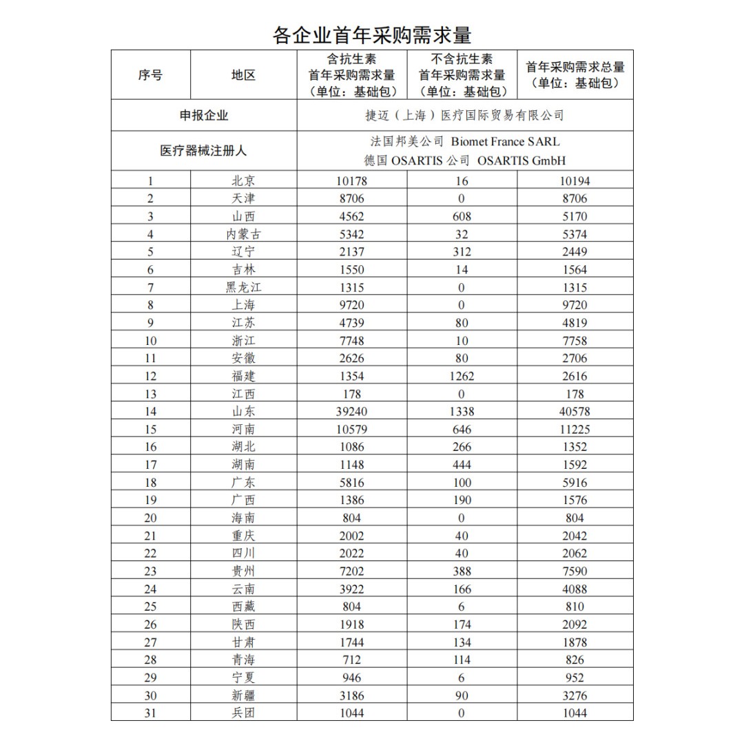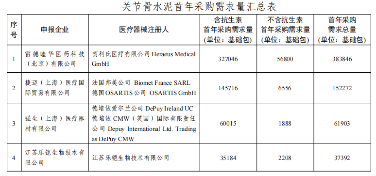 首年采購需求總量為673213個基礎包,其中關節骨水泥(含抗生素)需求總量為 595241 個基礎包,關節骨水泥(不含抗生素)需求總量為 77972 個基礎包。