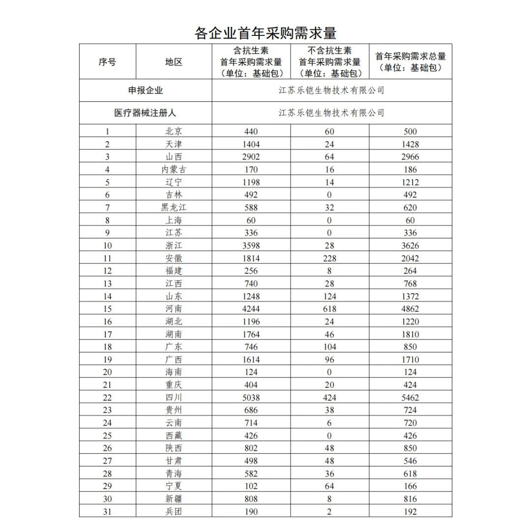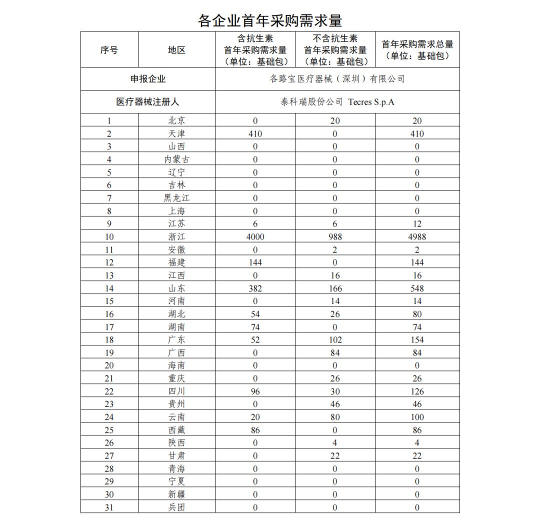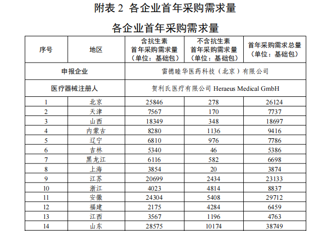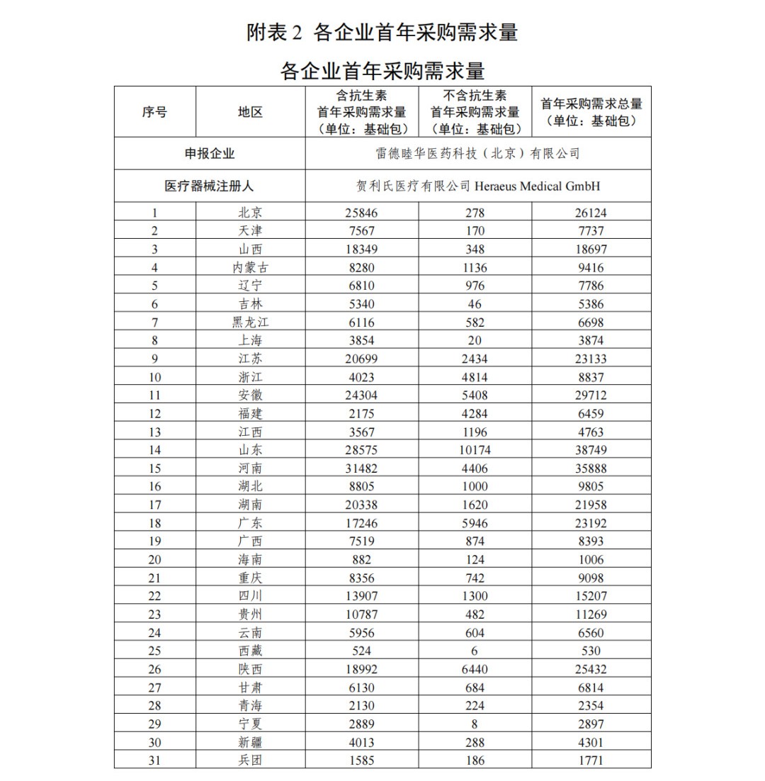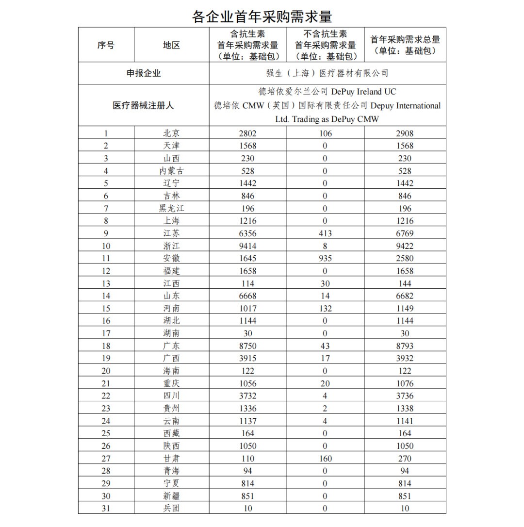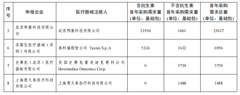 采購需求量方面,《采購文件》指出,首年采購需求量按參加本次集中帶量采購的每一家醫療機構報送的采購需求量累加得出,以 20g 粉末所對應的關節骨水泥產品為 1 個“基礎包”統計(不同包裝規格產品按粉劑重量等比例轉換為基礎包數量,如出現小數,則向下取整至個位)。
