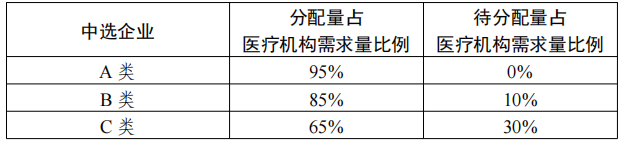 第二步:醫療機構填報采購需求量但未中選產品采購需求量的 95%和未申報產品采購需求量的 95%(如出現非整數則向上取整至個位)以及中選產品的待分配量共同組成剩余量,由醫療機構自主分配給 A 類企業以及本醫療機構已填報采購需求量企業中價格最低的企業,且分給A類企業的量不少于剩余量的50%。