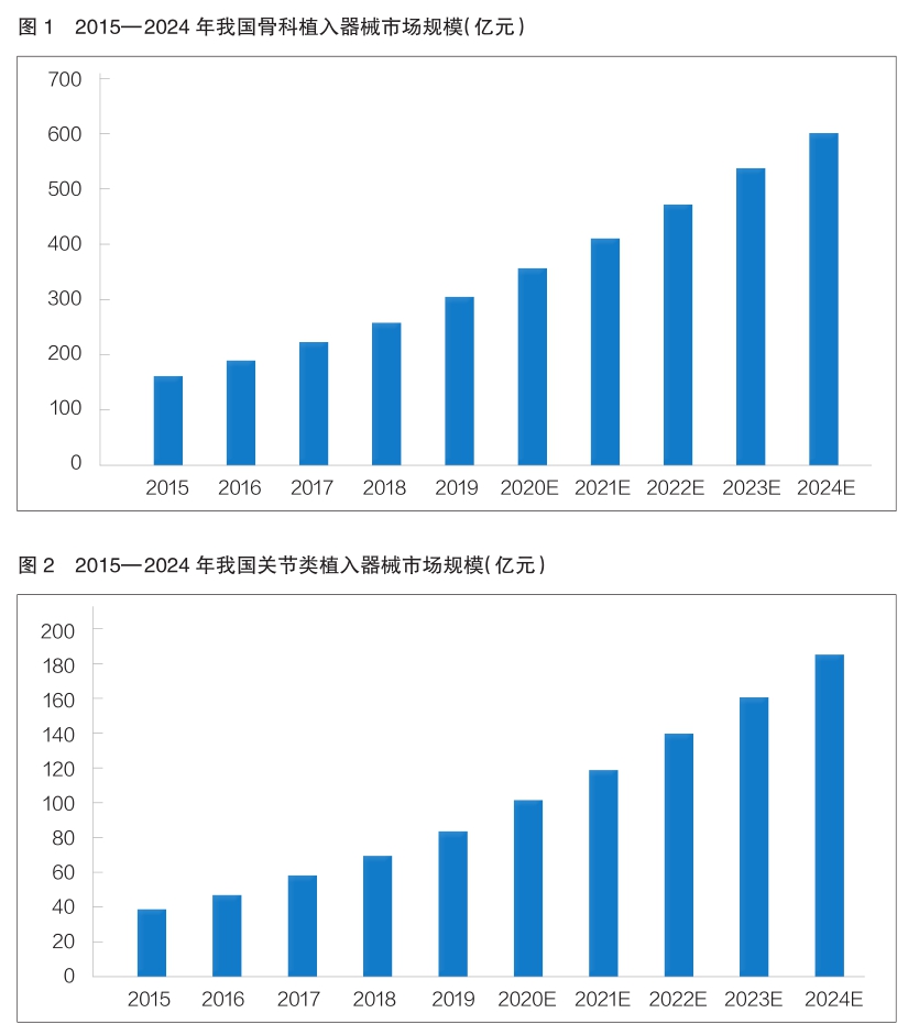 關(guān)節(jié)類植入器械市場增速最快。標點信息發(fā)布的數(shù)據(jù)顯示,2015—2019年,我國關(guān)節(jié)類植入器械市場的銷售收入已由40億元增長至86億元,年復(fù)合增長率為20.65%;預(yù)計到2024年,我國關(guān)節(jié)類植入器械市場規(guī)模將達到187億元(詳見圖2),且仍將以相對較快的增速發(fā)展。
