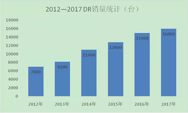 根據對中國醫療器械協會及中國醫用裝備協會數據,2007年我國DR設備年銷量僅為720臺,到2012年,我國DR設備年銷量增長到7000臺,到2015年已經增長到12800臺。