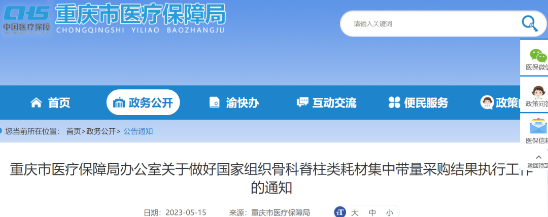 今日(5月15日),重慶市醫(yī)保局官網(wǎng)發(fā)布《重慶市醫(yī)療保障局辦公室關(guān)于做好國(guó)家組織骨科脊柱類(lèi)耗材集中帶量采購(gòu)結(jié)果執(zhí)行工作的通知》,明確自5月31日起,執(zhí)行國(guó)家組織骨科脊柱類(lèi)耗材集采結(jié)果。